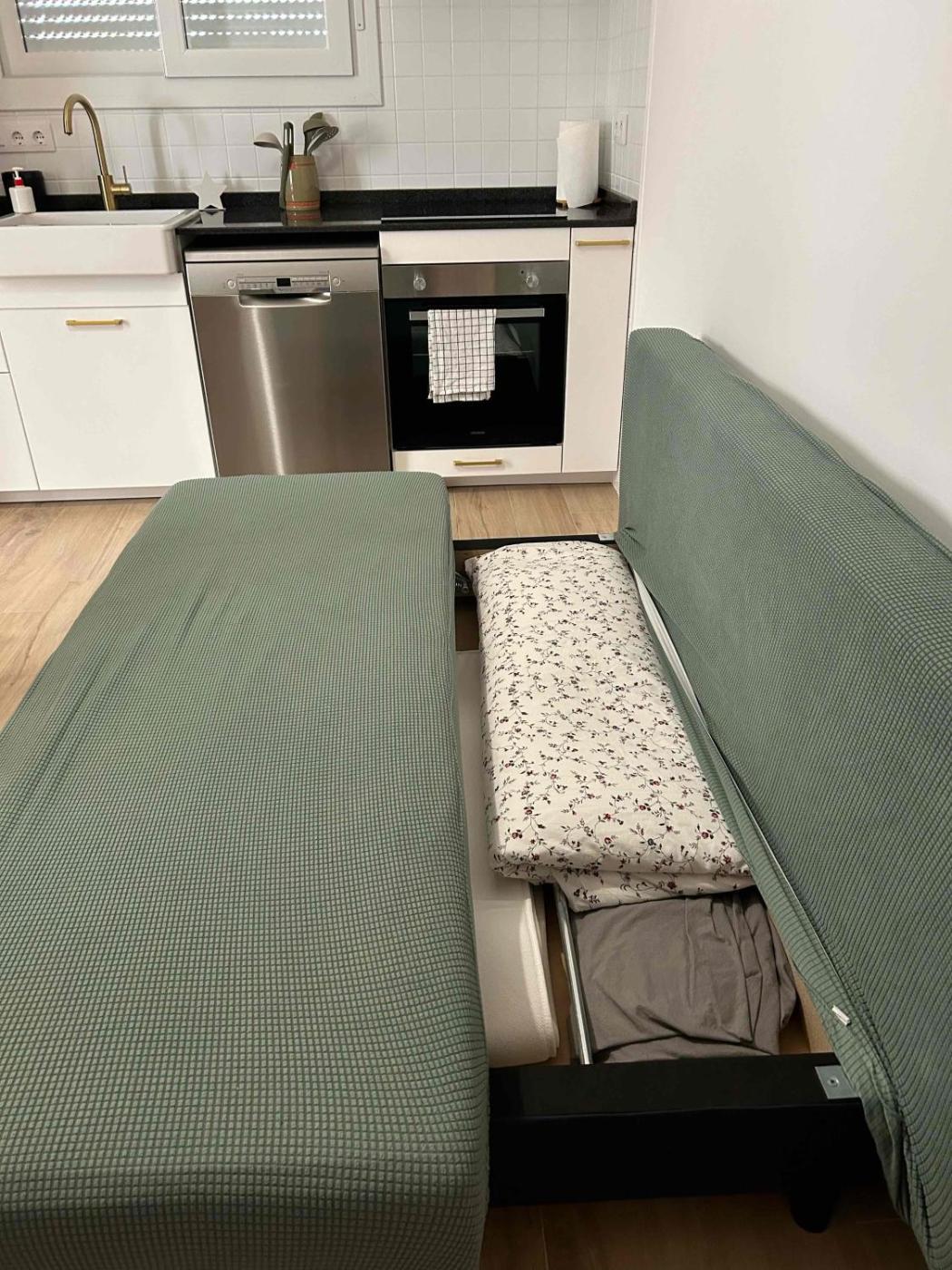 Apartamento de 1 dormitorio. This air-conditioned apartment comprises 1 living room, 1 separate bedroom and 1 bathroom with a walk-in shower. Guests can make meals in the kitchen that is equipped with a stovetop, a refrigerator, a dishwasher and kitchenware. Featuring a patio, this apartment also provides a washing machine, a tea and coffee maker and a flat-screen TV. The unit offers 2 beds.